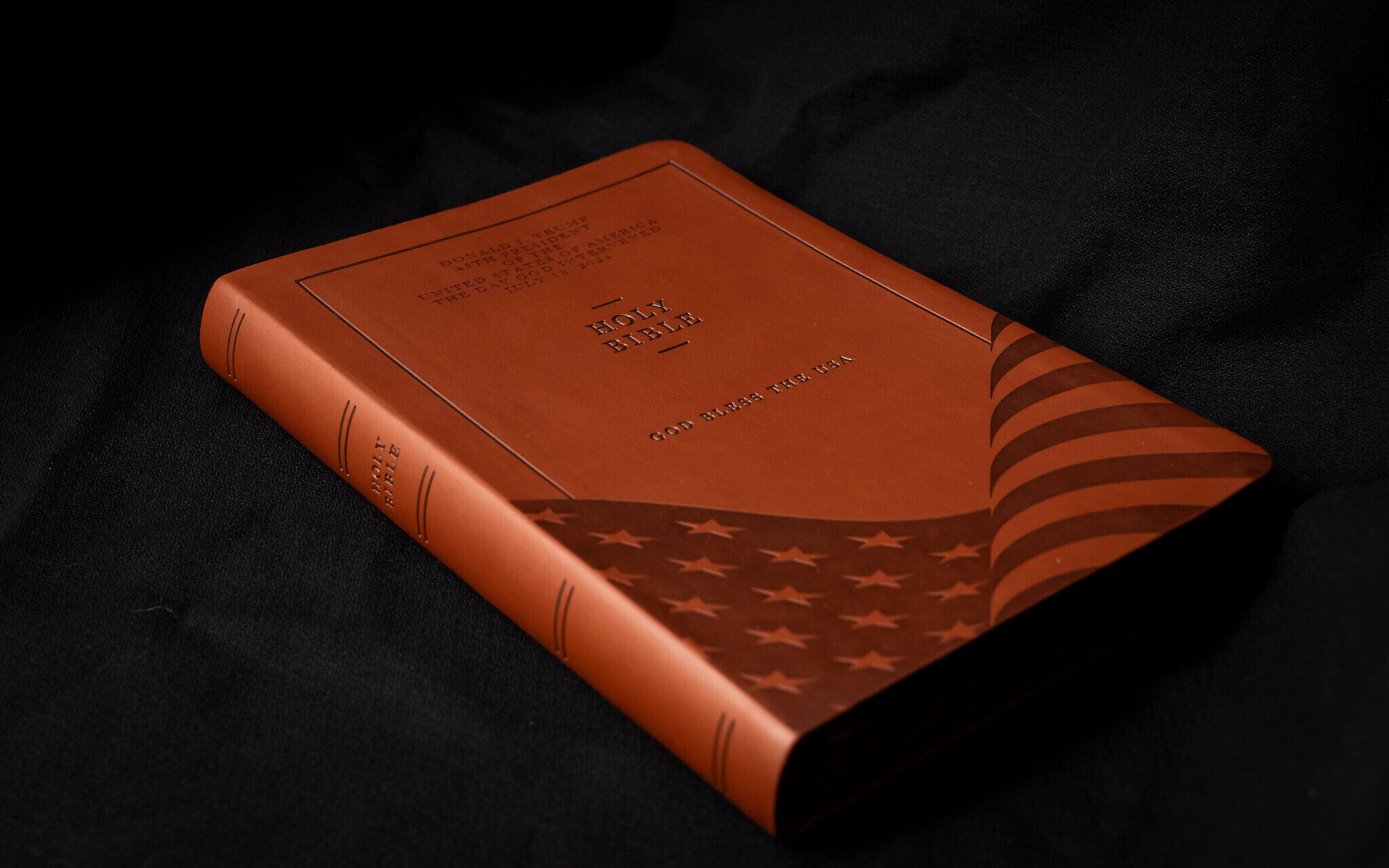 The front cover of the ‘God Bless the USA’ Bible sold by US President Donald Trump, then the Republican nominee seeking to return to the White House, is seen in Washington on October 8, 2024. (AP Photo/Ben Curtis)