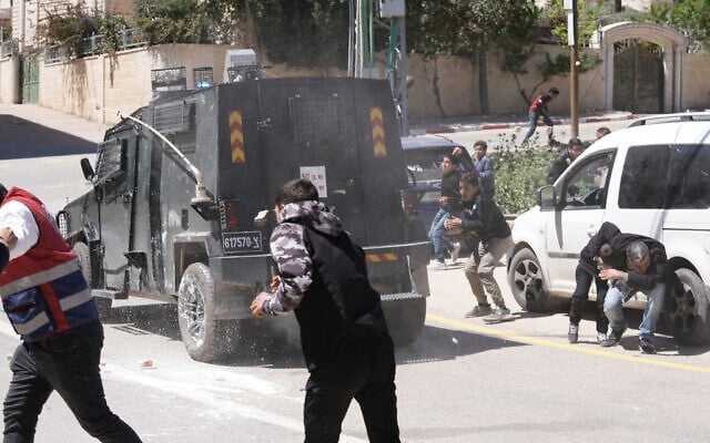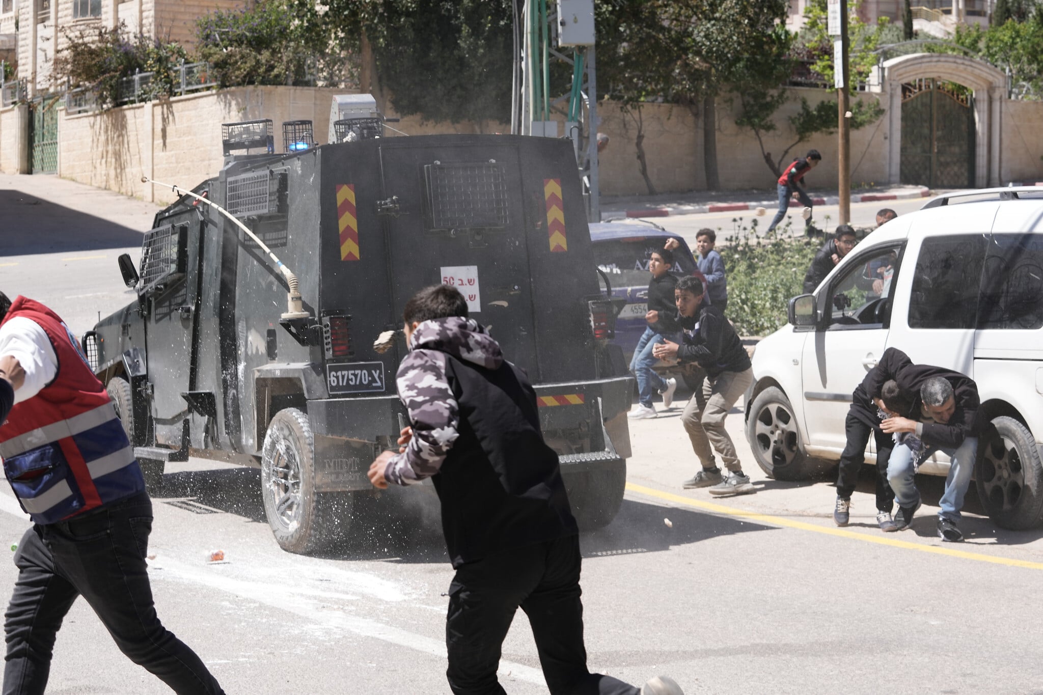 People clash with Israeli border police in the West Bank village of al-Mughayyir, April 22, 2026. (AP Photo/Mahmoud Illean)