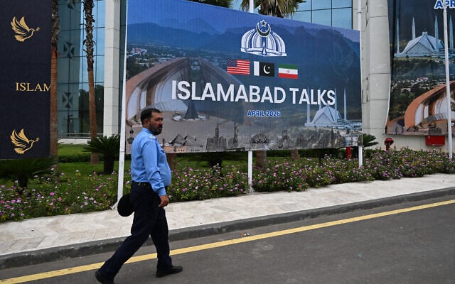 A police officer walks past a billboard for the US-Iran talks in Islamabad on April 11, 2026 (Aamir QURESHI / AFP)