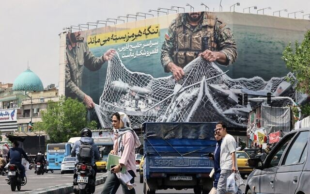 Iranian walks past a giant billboard reading “The Strait of Hormuz remains closed,” at Revolution Square in Tehran on April 22, 2026. (Atta Kenare/AFP)