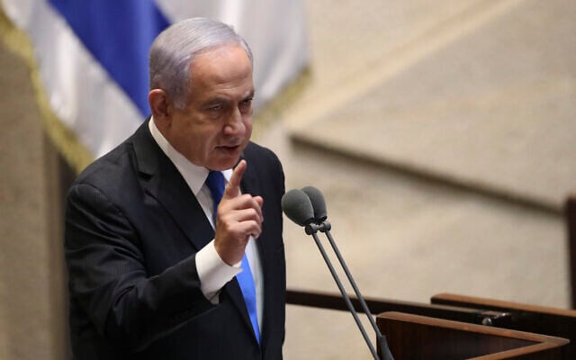 Israel’s outgoing prime minister Benjamin Netanyahu speaks during a Knesset session in Jerusalem, Sunday, June 13, 2021. (AP Photo/Ariel Schali22