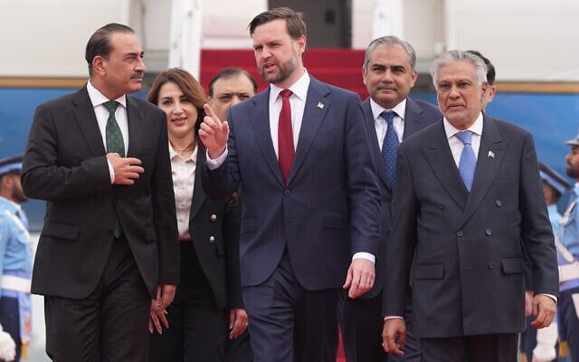 US Vice President JD Vance, center, walks with Pakistan’s Chief of Defense Forces and Chief of Army Staff Field Marshall Asim Munir, left, and Pakistani Deputy Prime Minister and Foreign Minister Mohammad Ishaq Dar after arriving for talks with Iranian officials in Islamabad, Pakistan, April 11, 2026. (AP/Jacquelyn Martin, Pool)