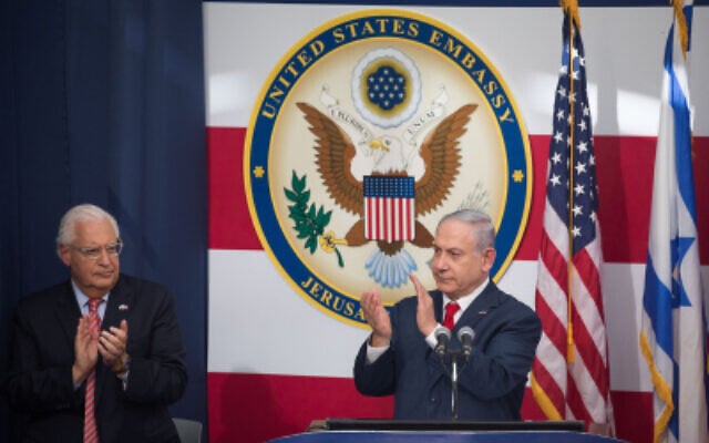 Prime Minister Benjamin Netanyahu (right) with US Ambassador to Israel David Friedman at the official opening ceremony of the US embassy in Jerusalem on May 14, 2018. (Yonatan Sindel/Flash90)