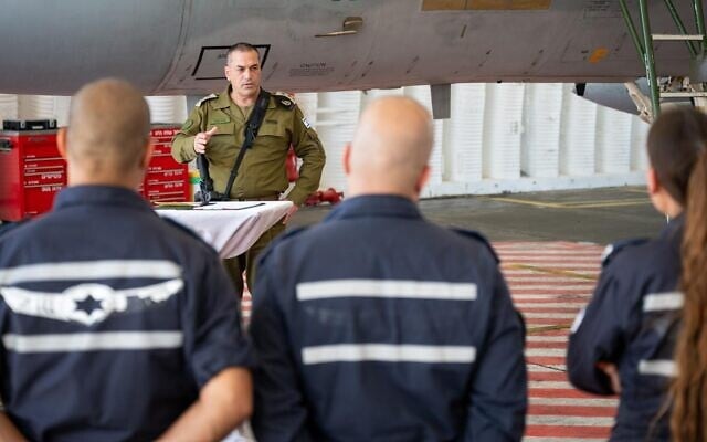 IDF Chief of Staff Lt. Gen. Eyal Zamir meets aircrews and technicians at Tel Nof Airbase, June 14, 2025. (Israel Defense Forces)