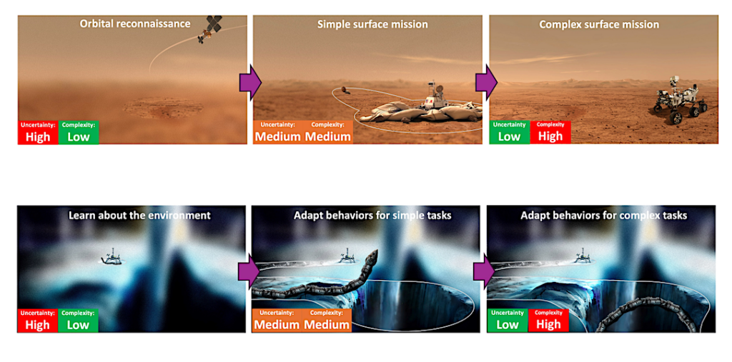 TOP: Planetary Exploration 2.0: Incremental sophistication over many missions, where the behaviors of the space system of each mission are largely pre-designed and fixed based on detailed environmental knowledge brought by prior missions. BOTTOM: Planetary Exploration 3.0 (Proposed): One-shot exploration with a highly adaptive space system, which evolves its behaviors in situ for incrementally complex tasks as it learns more about the environment. — astro-ph.IM