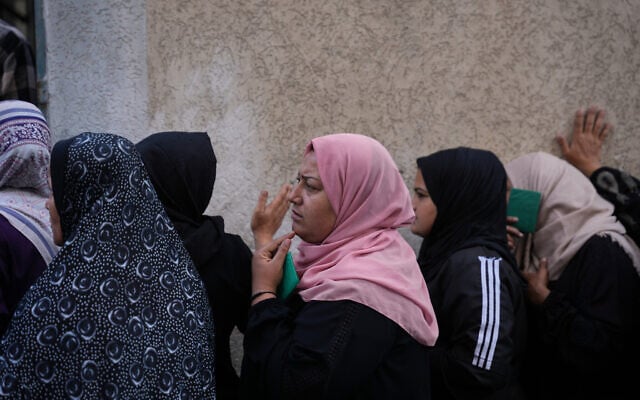 Palestinian women line up in front of a polling station to vote for local elections in Deir al-Balah, central Gaza Strip, April 25, 2026. (AP/Abdel Kareem Hana)