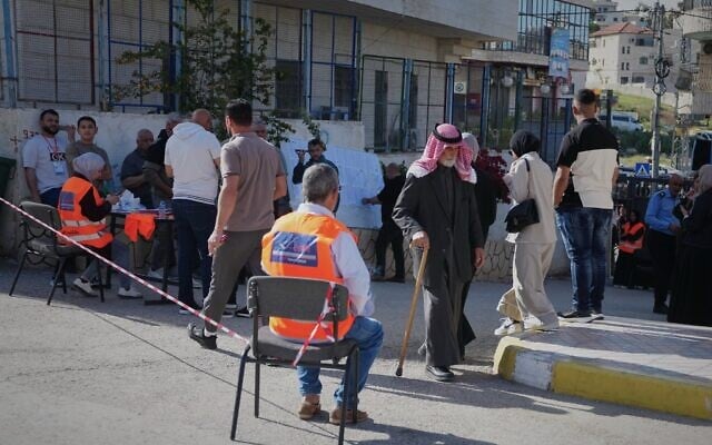 Palestinians line up to vote in local elections in Al-Ubaidiya, West Bank, April 25, 2026. (AP/Mahmoud Illean)