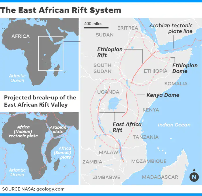These events are driven by the buildup of pressure from rising magma, which eventually forces the crust to crack. Over time, these cracks will grow, and the Gulf of Aden and the Red Sea will flood into the rift, creating a new ocean and breaking Africa into two continents: The smaller continent will include present-day Somalia and parts of Kenya, Ethiopia, and Tanzania, while the bigger one will include everything else in Africa.