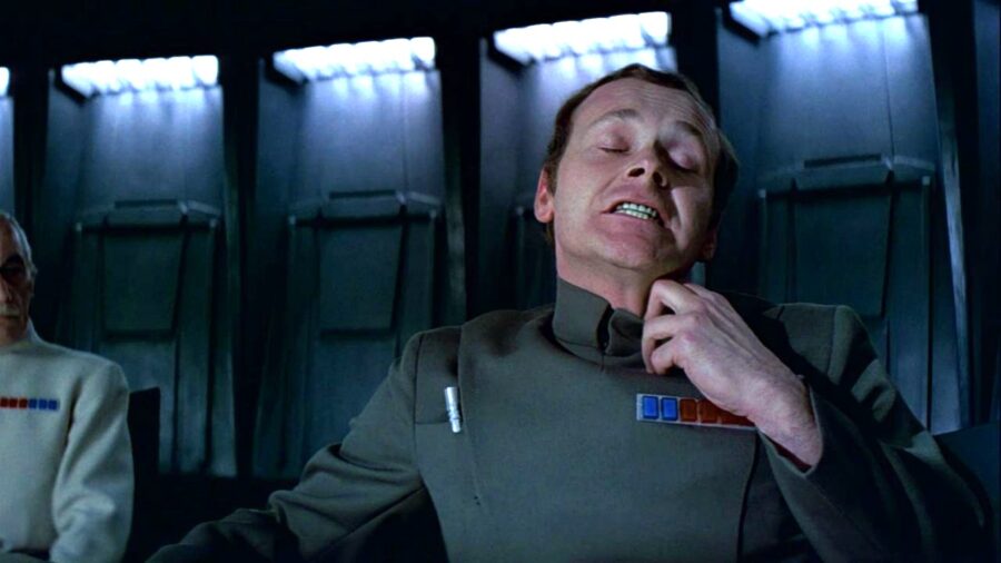 Instead of yielding to Vader, Motti hilariously claps back, telling the Sith, “Don’t try to frighten us with your sorcerer’s ways, Lord Vader. Your sad devotion to that ancient religion has not helped you conjure up the stolen data tapes, or given you clairvoyance enough to find the Rebels’ hidden fort–.” The last word is cut off when Vader decides to Force choke the man, and he only releases his grip when ordered to do so by Grand Moff Tarkin.