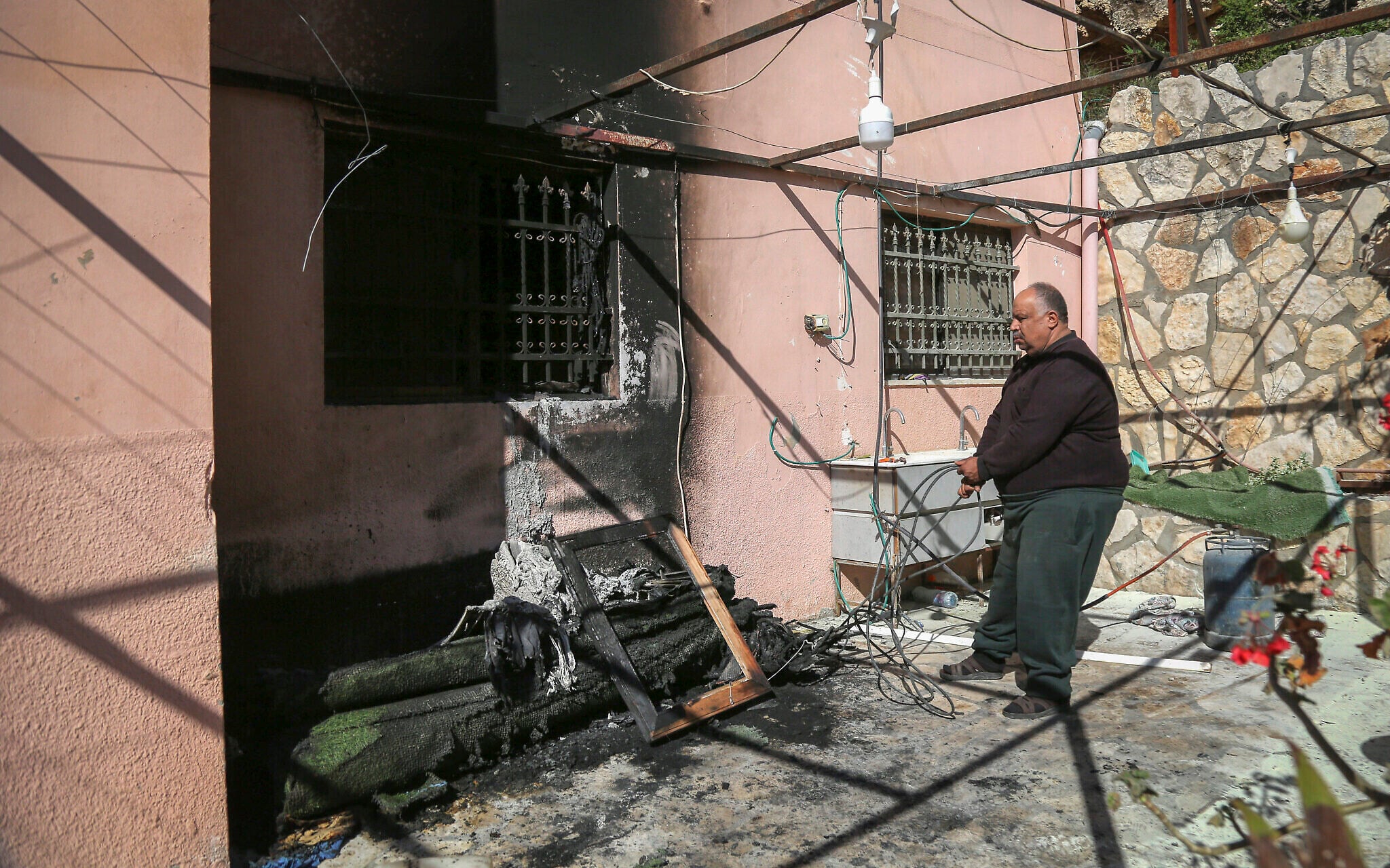 Palestinians stand at the scene where vehicles and a home were set on fire following an attack by extremist Jewish settlers in the village of Beit Amrin, west of Nablus, in the West Bank, April 22, 2026. (Nasser Ishtayeh/Flash90)