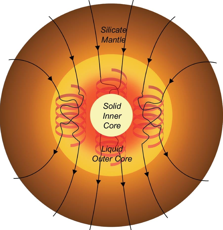 Cartoon cross-section of the Earth showing the mantle, outer core, and inner core. Convection in the outer core produces Earth’s geomagnetic field. The properties of Earth’s iron-rich core are key to understanding our planet’s deep interior, from its temperature to the way it generates the global magnetic field. The core’s exact chemistry remains unknown, but new research suggests that the process which triggered the freezing of the solid inner core from the surrounding liquid outer core could reveal its composition and shed light on its mysterious properties. Credit: Dr. Alfred Wilson