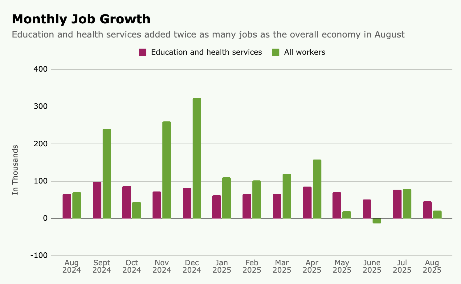The household survey tells us women are less likely to be employed than last year, with the employment ratio falling from 57 percent to 56.1 percent while the figure for men is roughly unchanged. The establishment data shows average job gains over the last six months of around 64,000 a month (that figure was 134,000 a year ago), with very narrow job growth across industries over the summer. What stands out is that education and health services, a field where three-quarters of workers are women, have added twice as many jobs as the overall economy this summer, even as the other sectors of the economy have lost net jobs. Going back six months, this field has added about as many jobs as the economy overall.Â