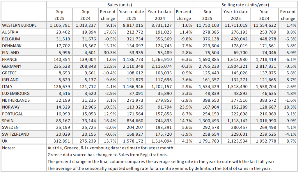 France and Italy also grew by 1% and 4% respectively; however, both results were disappointing as September 2024 is a weak base for comparison for both markets. France is grappling with persistent political uncertainty regarding its 2026 budget, which is undermining consumer confidence. Compounding the situation, newly appointed Prime Minister Sebastien Lecornu resigned after less than a month in office. Meanwhile, in Italy, sales have remained sluggish due to a weak economic backdrop — moving forward, the market should be supported by the implementation of a €600 million subsidy package under the National Recovery and Resilience Plan.