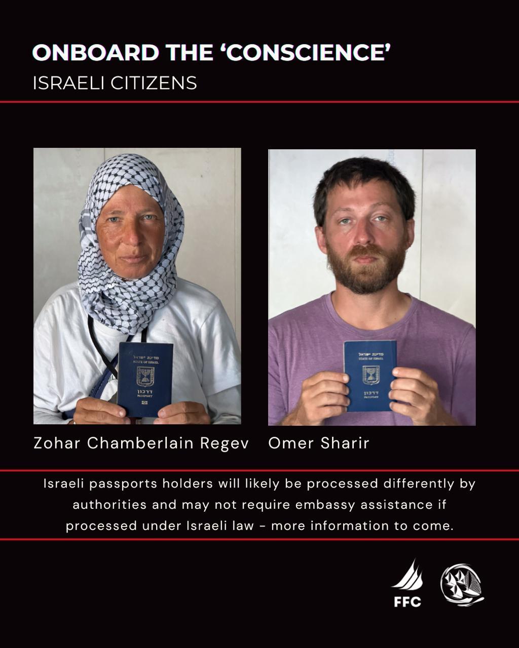 The organization also published a graphic of two Israelis who it said were on board the Conscience, but it did not call to contact Israeli authorities to demand their release. “Israeli passport holders will likely be processed differently by authorities and may not require embassy assistance if processed under Israeli law,” the FFC said.