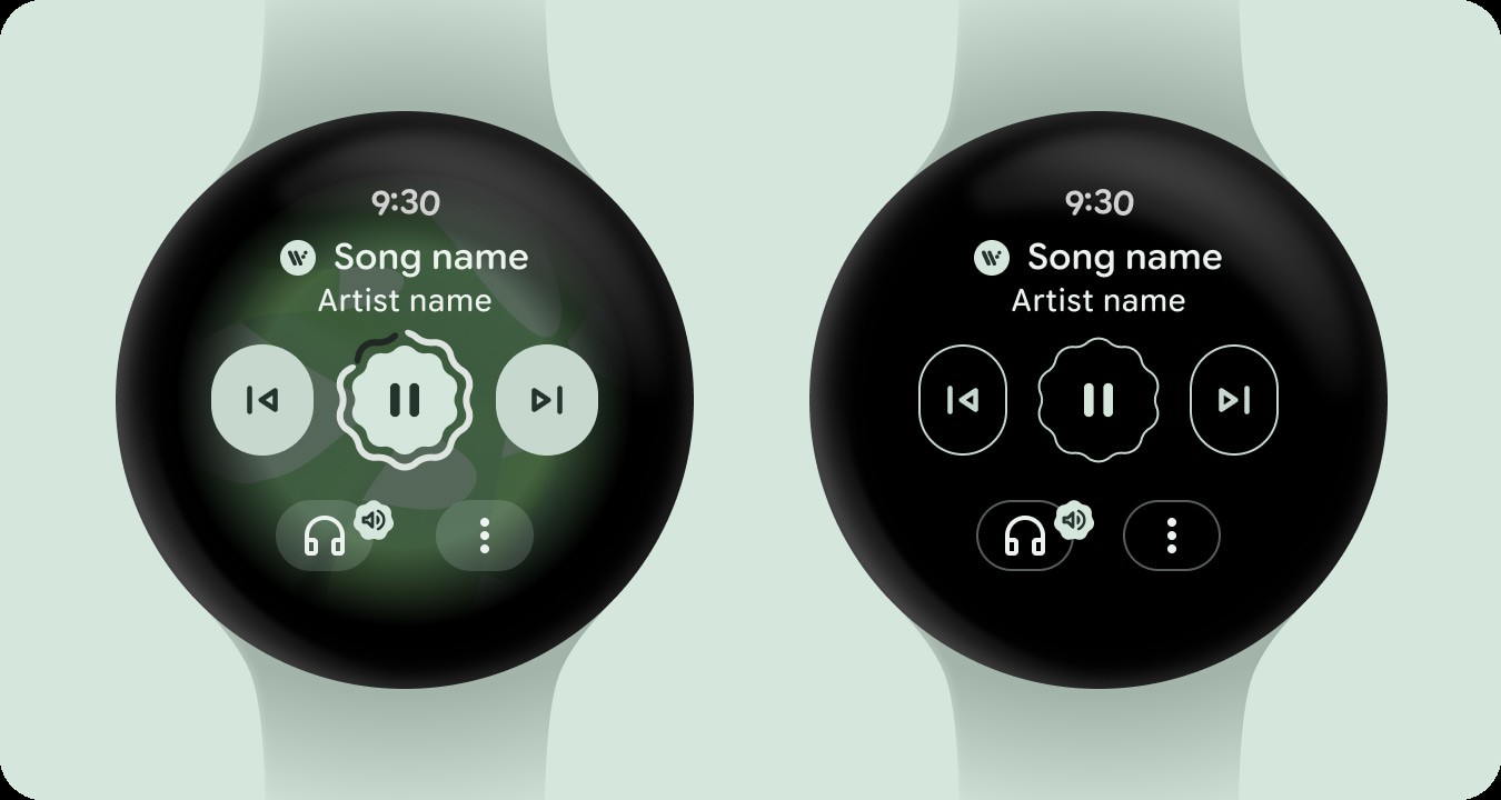 The example Google provided was how the “current song and media controls remain visible even when the user isn’t interacting with the Wear OS device.” At the left (above), we see the redesigned Material 3 Expressive Media Controls that went live on the Pixel Watch 4, and the Wear OS 6 update for the Pixel Watch 2 and 3. (The other tweak Google made was adding a music note icon for the complication and at the bottom of your watch face.)
