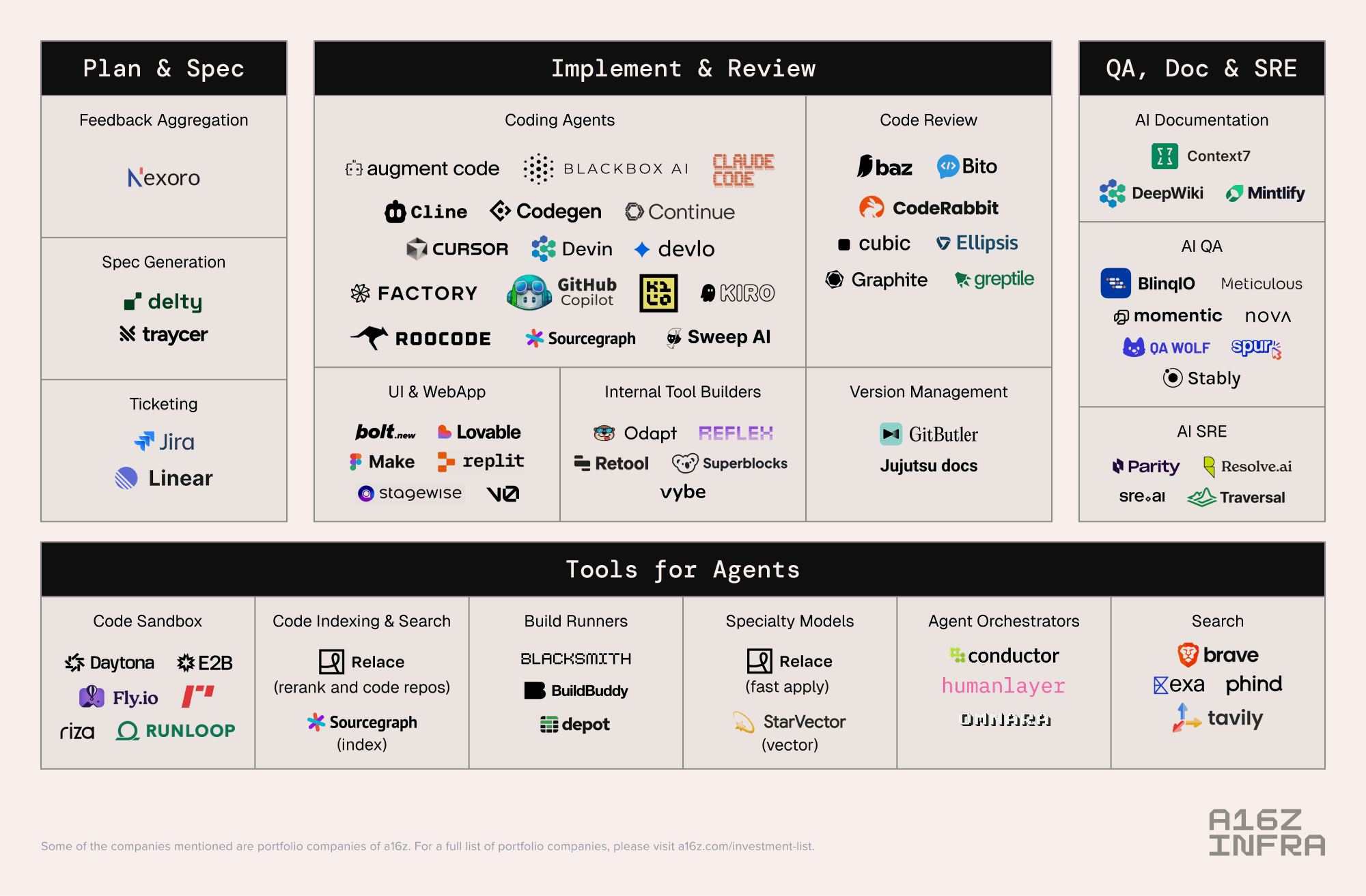 Below we try to lay out the broader AI coding start-up ecosystem. The layout roughly follows the software development lifecycle outlined earlier, with additional categories. Companies are listed in no particular order. Products from incumbents are occasionally included.