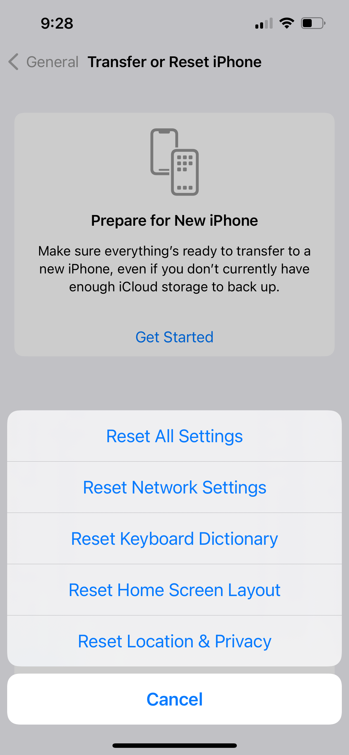 Go to Settings > General > Transfer or Reset iPhone > Reset