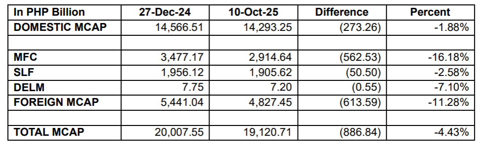 In a statement, the local bourse clarified that domestic MCAP was only down P273 billion or 1.88% from December 2024 to October 2025.