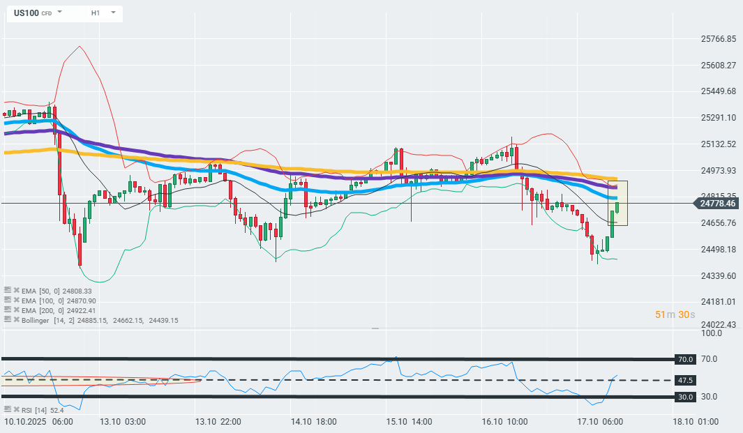 Indices such as the US100 and other contracts on major US indices are rebounding after a series of relatively mild and optimistic comments from the former president – he emphasized, among other things, that “a 100% tariff is not a long-term solution,” and that negotiations with China must aim for a “fair agreement.” In addition, Trump announced a meeting with President Xi within the next two weeks, which the market interprets as potential for further de-escalation of trade tensions.