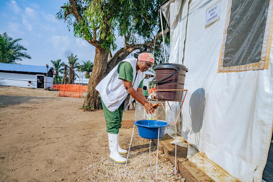 A health worker washes her hands at an Ebola treatment center in the Bulape health zone, the Democratic Republic of the Congo (DRC), Oct. 17, 2025. (World Health Organization/Handout via Xinhua)