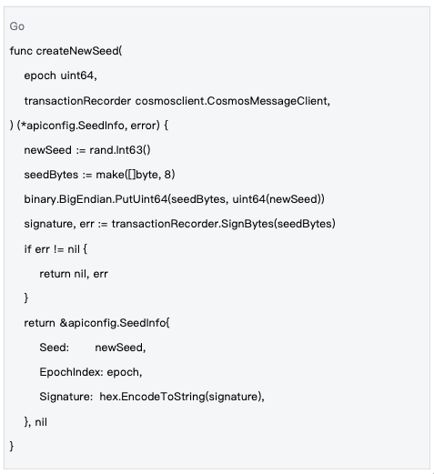 Management mechanism : Seeds are managed at the epoch level. A new seed is generated at the beginning of each epoch and synchronized to the entire network through blockchain transactions to ensure that all nodes use the same randomness base.