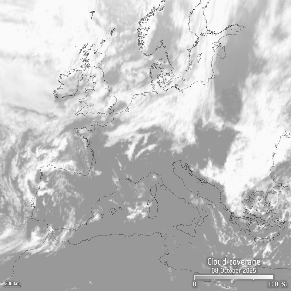 It should be noted that Sentinel-4 cannot measure nitrogen dioxide over areas covered by cloud, which is why the image does not display concentrations in certain areas of the map. The image on the right shows cloud cover at the time.