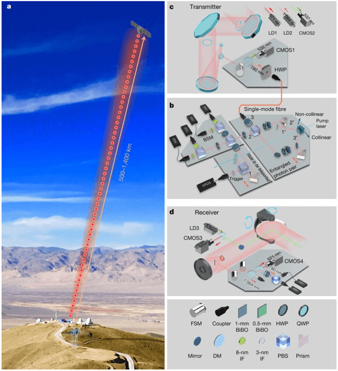 One of the qubits, a photon, was transmitted to the Micius satellite in low-Earth orbit… via an optical uplink.