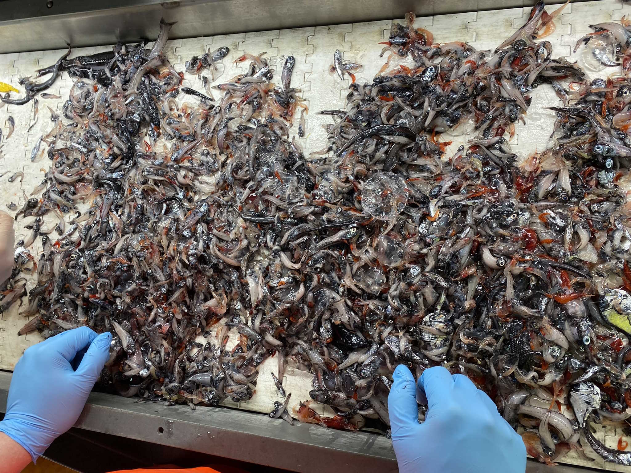 Contents of a net fished in the Atlantic Ocean’s mesopelagic zone. Small lanternfish (Benthosema glaciale) dominate the catch, alongside other fish species and invertebrates such as crustaceans and gelatinous zooplankton. Image by HulloThere via Wikimedia Commons (CC BY 4.0).