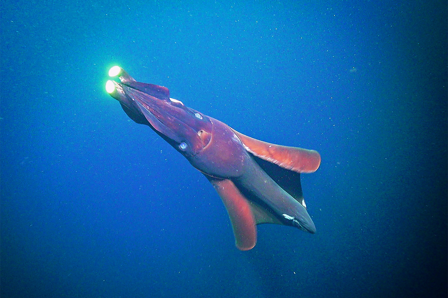 A Dana octopus squid (Taningia danae), found in the mesopelagic zone. Image by Schmidt Ocean Institute (CC BY-NC-SA 4.0).