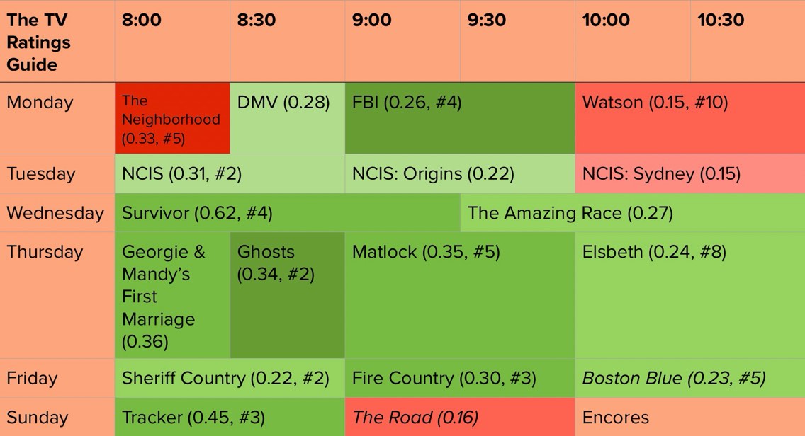 Matlock: Perhaps the surprise of the season is the sudden, unexpected collapse of one of last season’s surprise hits, Matlock. CBS was all-in on season two, giving it the only post-NFL debut of any of their fall shows outside of the regularly-scheduled Tracker (Elsbeth also aired that night, though a further hour removed from the NFL lead-in), and giving it its fair share of promotion. None of that was enough to stop it from utterly cratering. Discounting that NFL-boosted 0.51 premiere, as post-NFL ratings almost never reflect a show’s genuine audience (Tracker is one reasonable exception here – it’s a huge hit  with similar ratings whether it airs on an NFL night or not), this is a show that went off the air with a 0.48 rating, at the time a series high. It had dropped a good deal lower than that before, but it was still clearly a hit, and it was usually good for at least a solid 0.3, if not a rounded 0.4. It was never a ratings liability. Come the day of its time slot premiere, this show only manages a 0.18. It was the lowest-rated 9 PM show of CBS premiere week, and shed over 60% of its demo rating. It was also meaningfully down in viewers. It had never dropped below 5.6 million viewers before, and returned with just 4.2 million viewers. The time slot premiere was down two million viewers from its season one average, a 33% decline. This is a disaster. However, it’s not getting downgraded just yet. It’s very possible that it could be in the future, but the most important factor here is how it streams on Paramount+, especially with Skydance emphasizing the importance of the streamer. It was one of CBS’s most-watched shows in multiplatform ratings last season, only rating behind Tracker there. It was a huge hit for them last season (far exceeding its relatively average linear ratings), and it’s getting the benefit of the doubt for now. If it looks middling in mutliplattform as well, it’ll find itself quickly downgraded. But it appears to be performing well on Paramount+ right now, if their daily top ten chart is any indication, and that’s really all we have to work with right now. It remains a certain renewal, albeit one that could quickly disintegrate.