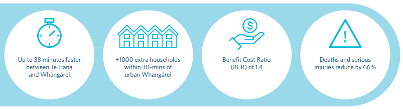 The claimed benefits for the Whangarei to Te Hana project note that it will be up to 38 minutes faster. The road is about 75km long, and Google tells me that most of the time it takes about 58 minutes to drive this distance. In this context, saving 38 minutes would be a massive amount – but it also equates to vehicles needing to average over 200km/h which doesn’t seem all that safe