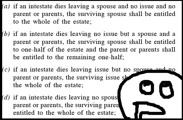 In other words: no Will = the law decides who gets what. Here’s a sample breakdown straight from the Distribution Act 1958: