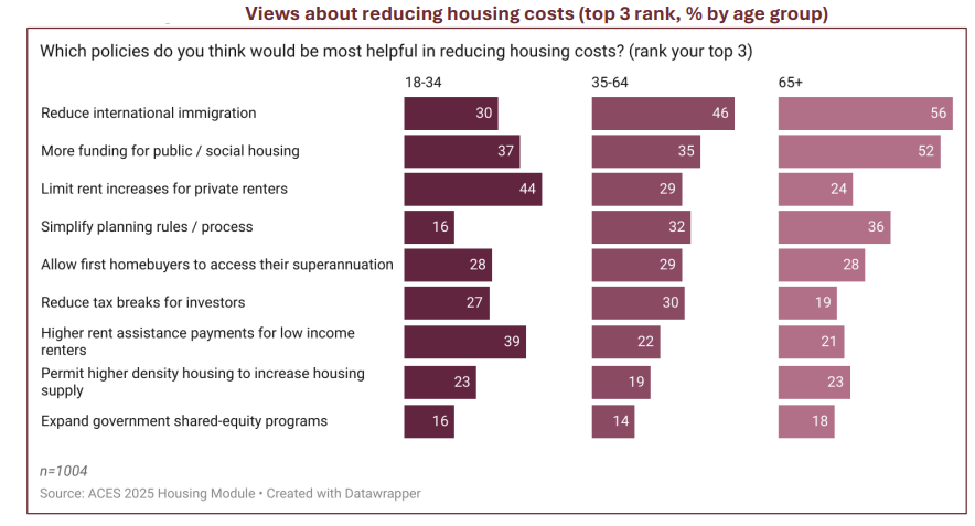 The young favour limiting rental increases and increasing rent assistance payments for low income renters, while cutting migration and more funding for public housing are the top choices for those aged 35+.