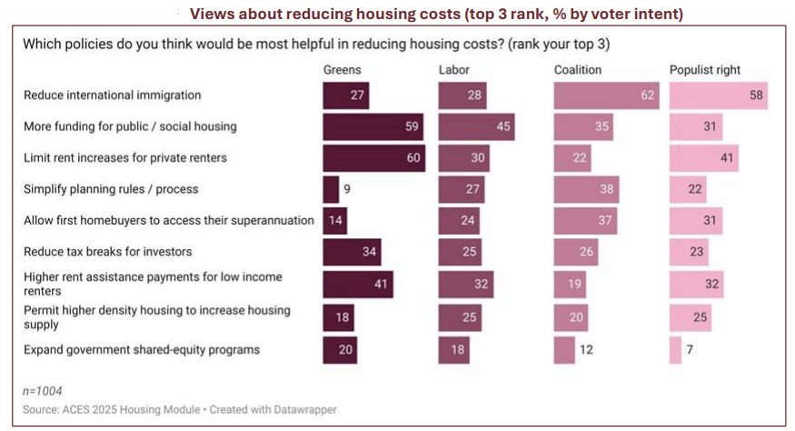 Left leaning voters think more public housing and rental concessions are the answer, while they’re less of a priority for Coalition voters who want lower immigration and fewer planning barriers.