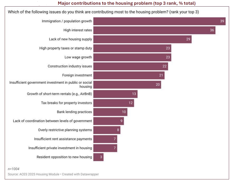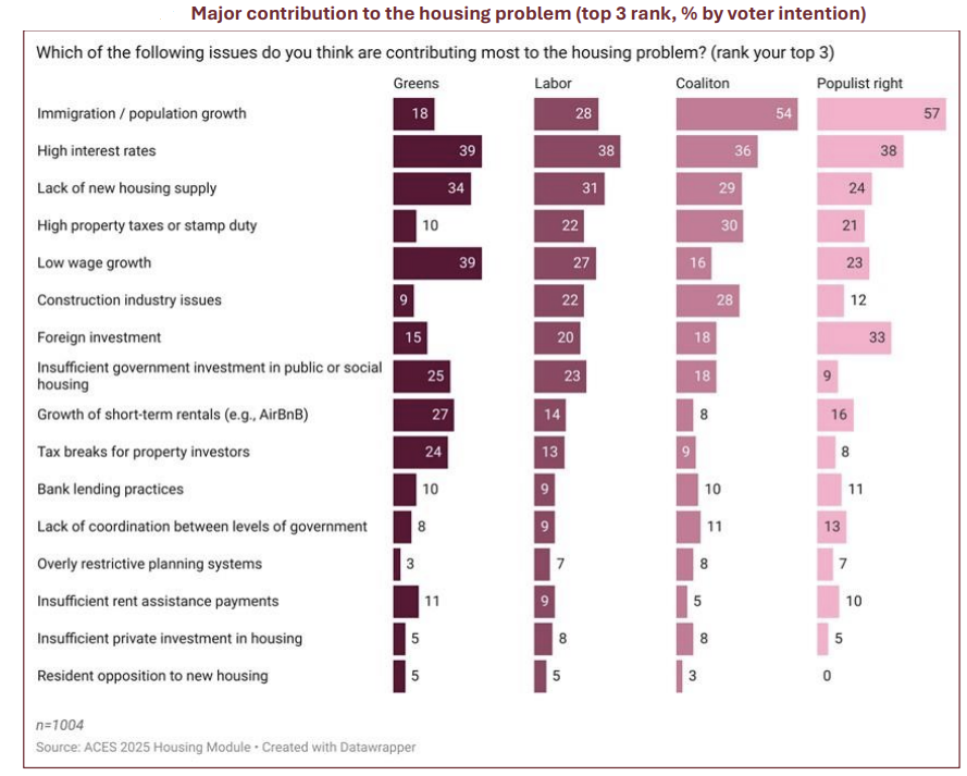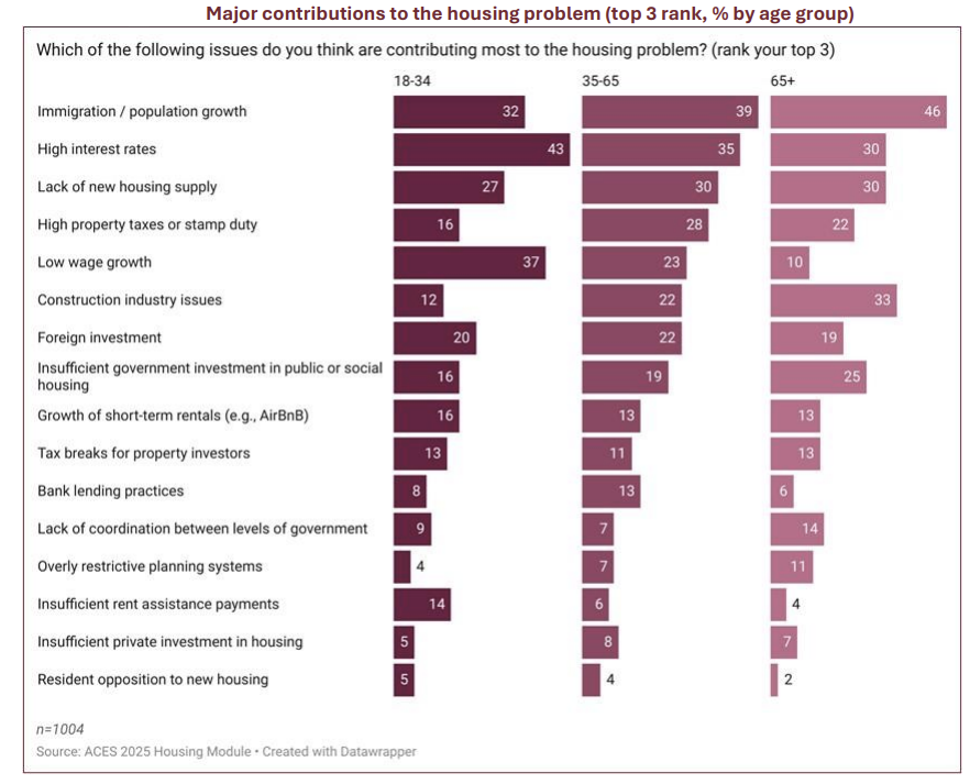Yet answers were divided along generational and ideological lines. Younger Australians and progressives nominated high interest rates and low wage growth as key contributors to housing issues. Meanwhile, conservatives and populist right voters blamed immigration.