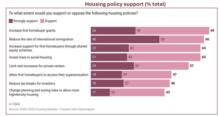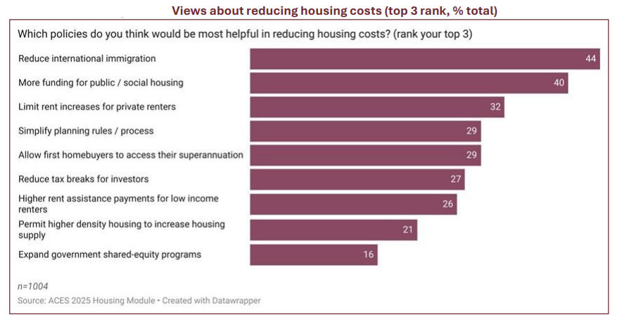 Asked about which policies would be most helpful in reducing house costs, the answers were different. Lower migration (44%), more funding for public/social housing (40%), and limiting rental increases (32%) topped the list.