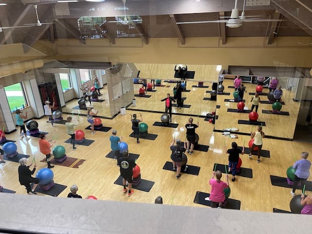 “From there, she created Drum Core using a large stability ball set up for drumming, so you don’t lean over as far to pound on the floor, and they do cardio with it. So there’s a focus on the core, but you also get cardio, and we find people can’t wait to go to that class and say the time goes by so fast.”