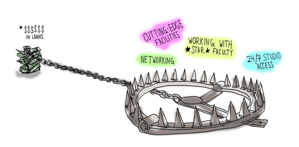 Art schools are marketed as gateways to success. However, the fine print tells a different story: crushing debt, unreliable outcomes, and a mismatch between what’s promised and what’s delivered. Students are advised that proximity to star faculty, prestige, and facilities will lead to visibility, residencies, teaching jobs, and gallery shows. Some achieve those things. Most leave with loans, little security, and skills that don’t match the marketplace. Beneath the rhetoric is a system designed to sustain institutional prestige, and it runs on debt.