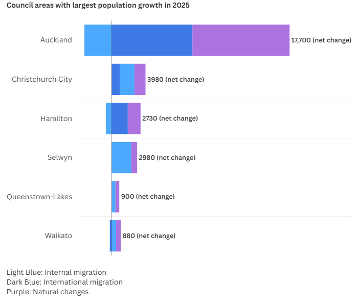 Well, it’s a bit unclear. The five fastest-growing council areas by total population are Auckland, Christchurch, Hamilton, Selwyn and Waikato. But the way that growth is happening is completely inconsistent. Auckland and Hamilton have negative internal migration, meaning people are leaving those cities for other parts of the country; their growth is driven by international migration and a high birth rate. Meanwhile, Selwyn and Waikato have negligible international migrants and are booming due to internal shifts: people are moving there from other regions of New Zealand. Christchurch is a rare example of a city that is succeeding at all three forms of growth.