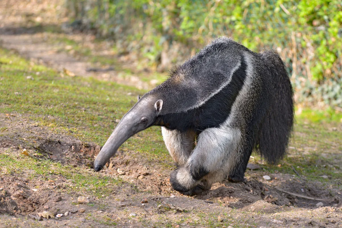 Giant anteaters are easily recognised by their unique appearance, especially their strange elongated, tubular snouts. Their head measures about 30cm long, with the cylindrical snout dominating most of its length. This remarkable nose is not just for show: it is a highly specialised tool for finding food. Equipped with an exceptional sense of smell, giant anteaters can detect insects like termites and ants from impressive distances.