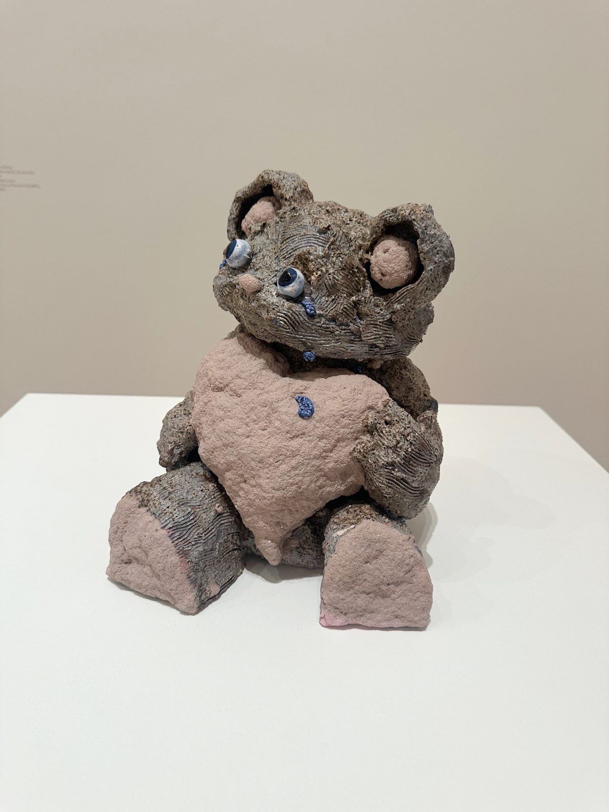 Another standout is an assemblage by Gabriela Ruiz comprised of cartoonishly painted screaming faces, a surveillance camera that displays the viewer on a screen, and an LED streetlamp. This piece perfectly embodies our fraught relationship with technology, wherein we willingly allow ourselves to be surveilled by social media platforms under the guise of connecting with others. These platforms have also manipulated and damaged our thought patterns, siloing us into our own personalized echo chambers and flattening commerce, memes, life milestones, and horrifying news clips into a single bland stream of content vying for our attention. The work is appropriately titled “Collective Scream” (2025).