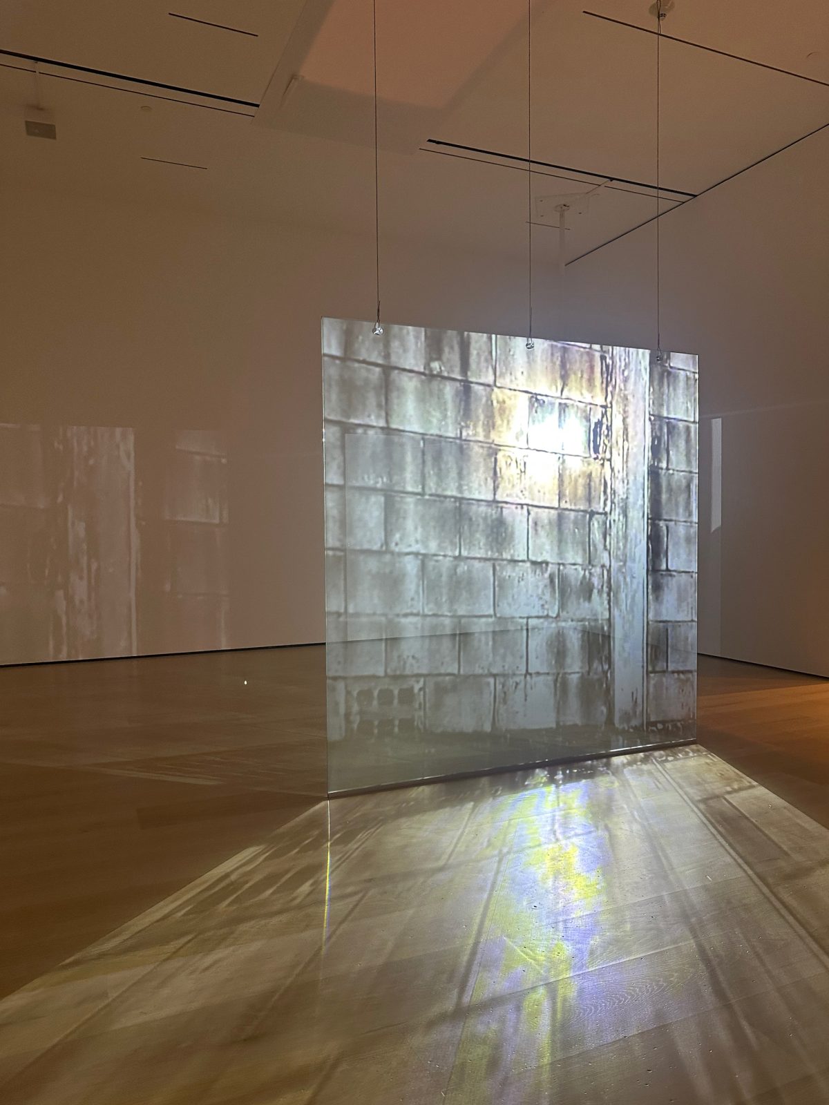 Na Mira disorients histories and mythologies in “Sugungga (Hello)” (2025).” The work references a Korean allegory in which a sick dragon king trying to cure itself lures and is subsequently tricked by a rabbit. Two videos are projected onto opposite sides of a holographic glass — one filmed in a cab driving around the outside perimeter of a walled former military building, constructed by the Japanese army and later used as a US military base, and the other showing an inflatable rabbit sculpture inside of the grounds. These projections collapse inside and outside. They cast ghostly moving shadows and distorted imagery around the room and onto other viewers. The story of Korea’s occupiers is literally embodied by this one building, and the work’s confusing boundaries cast the viewer as both victim and complicit co-conspirator, as both inside and outside systems of power.