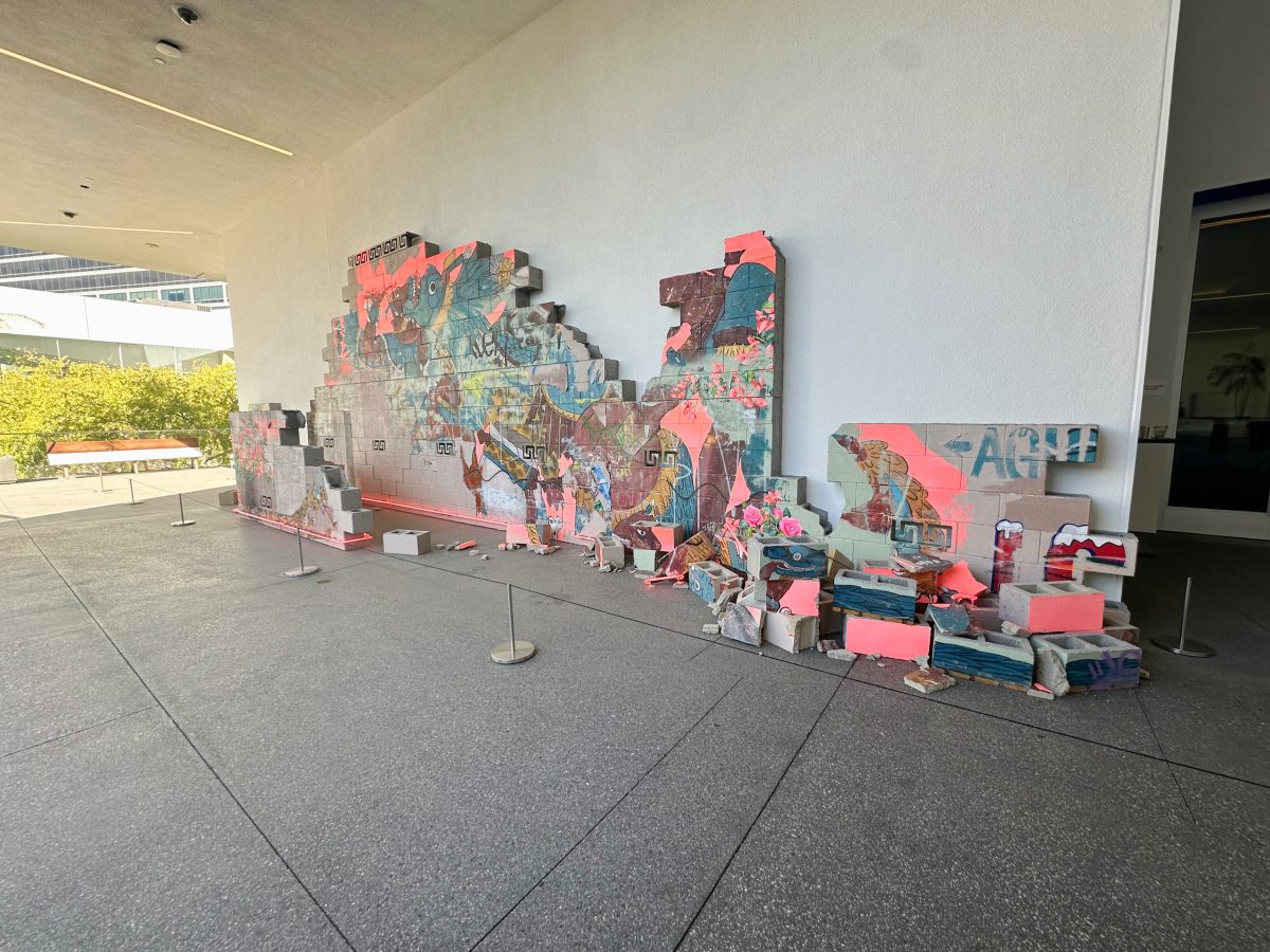 Other highlights include Amanda Ross-Ho’s hilarious and poignant oversized replicas of her father’s residential nursing home door adorned with seasonal decorations, Carl Cheng’s singular erosion machines, and Patrick Martinez’s installation of a ruined and graffiti’d cinderblock structure, “Battle of the City on Fire” (2025).