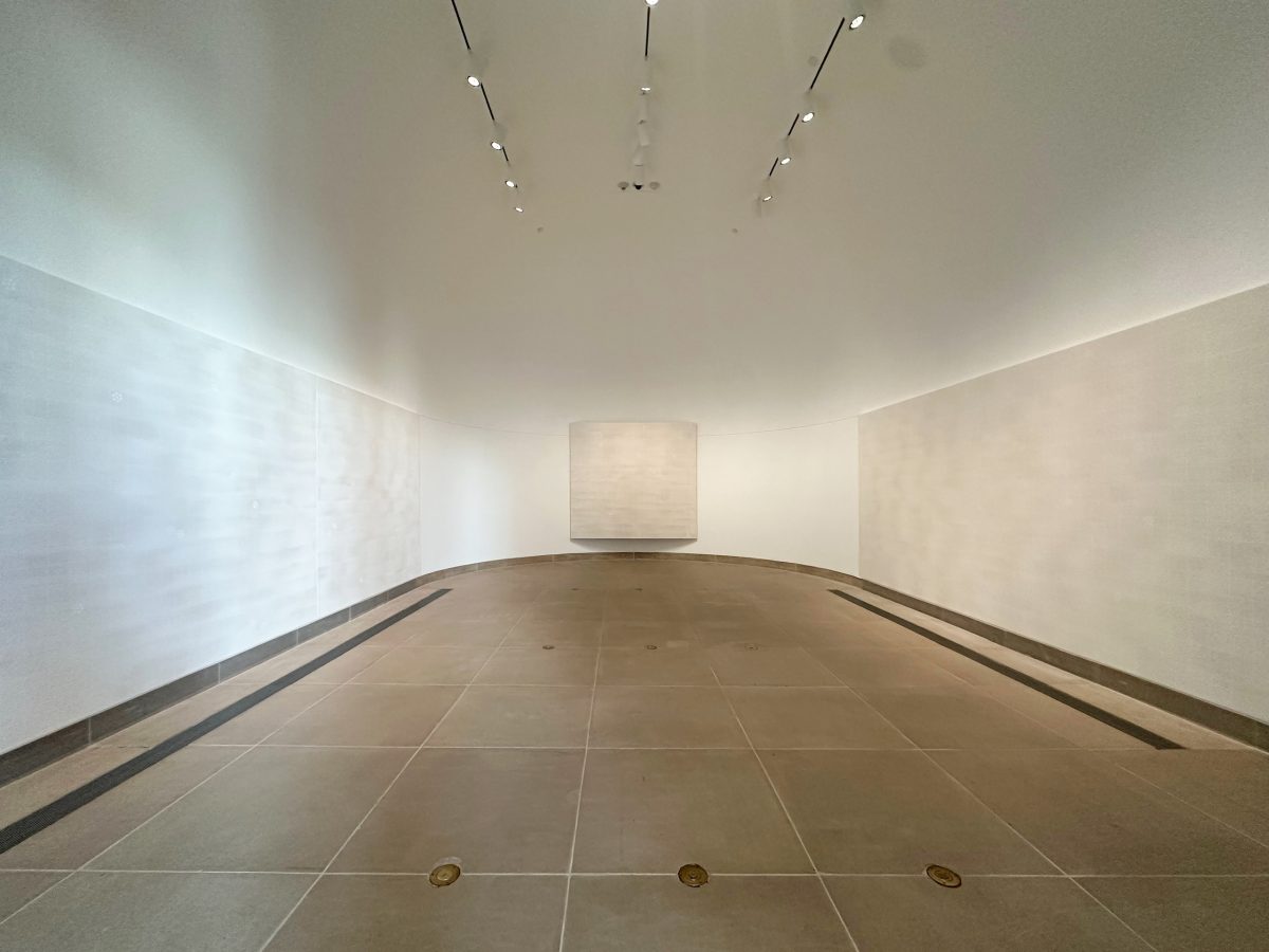 Despite this, the show contains some strong work, especially in cases where the artists have been given their own rooms — for example, Hannah Hur’s gorgeous five-panel installation “Suspension” (2025), installed in a vault-like gallery. Each painted panel consists of a grid of faint white lines dotted with white flower-like patterns. The interaction between the grid and the flower motif creates a sense of spatial confusion when viewing the work. This effect is only enhanced by the room’s architecture: The lines in the cement floor and the curved shadows cast from a panel, which appears to be floating in midair, become a vital part of the viewing experience. Hur’s quiet work transforms one’s perception of both the viewer’s physical space and the spaces she creates within each painting.