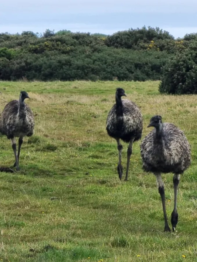 There was an attempt to establish a business farming emus (Dromaius novaehollandiae) in New Zealand late last century, but it never became a significant industry, though a few of the big birds remain here and there, mostly in small flocks (herds?) on lifestyle blocks. They’ve gone feral in a few areas, although they are still not officially recognised as part of the local avifauna. Chatham Island now has dozens roaming wild through central parts of the island; there’s talk of trying to eradicate them, but for now they’re an unexpected addition to the landscape: