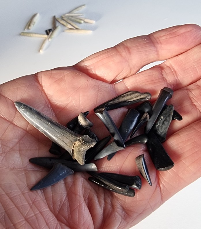 Much of Chatham Island is occupied by a huge brackish lagoon, along the shores of which, at a spot called Blind Jim’s Creek, you can find fossilised shark teeth. These are between 30 and 60 million years old; most are mako (Isurus oxyrhynchus, or perhaps an ancestor), but other species, including Otodus megalodon, also occur. In the background of the picture below there are also some fossilised urchin spines, which are present along with the teeth. Three of us found this collection in about an hour of searching: