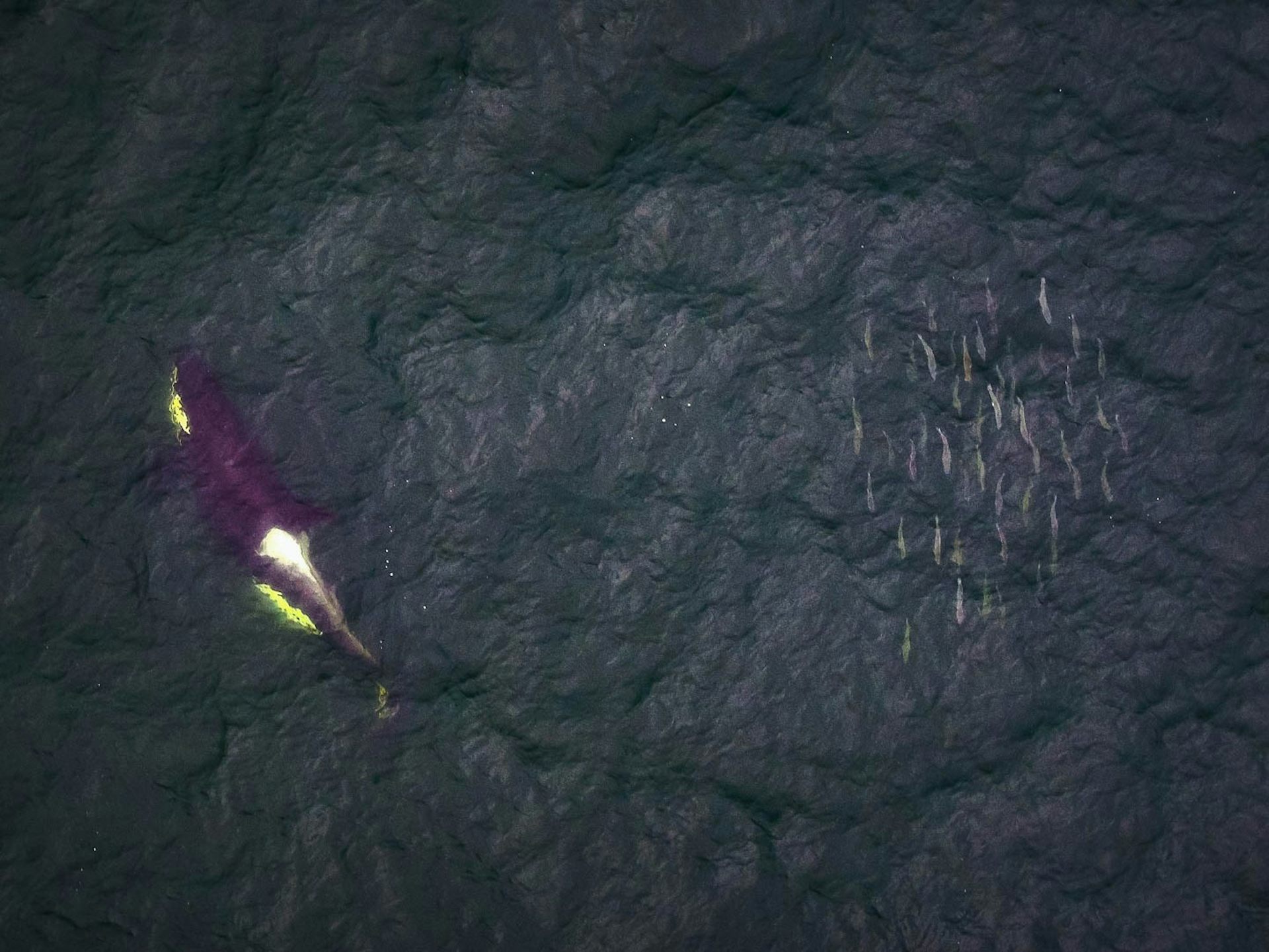 A southern resident killer whale swims past a school of salmon near the Fraser River, B.C.