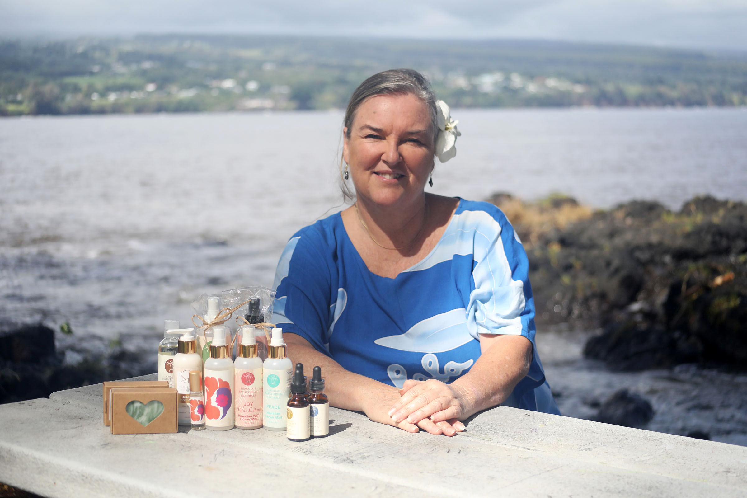 Melia Goodenow is photographed with some of the Hawaiian Rainforest Naturals products at Liliʻuokalani Park in Hilo on Saturday, Nov. 15, 2025. (Kelsey Walling/Big Island Now)