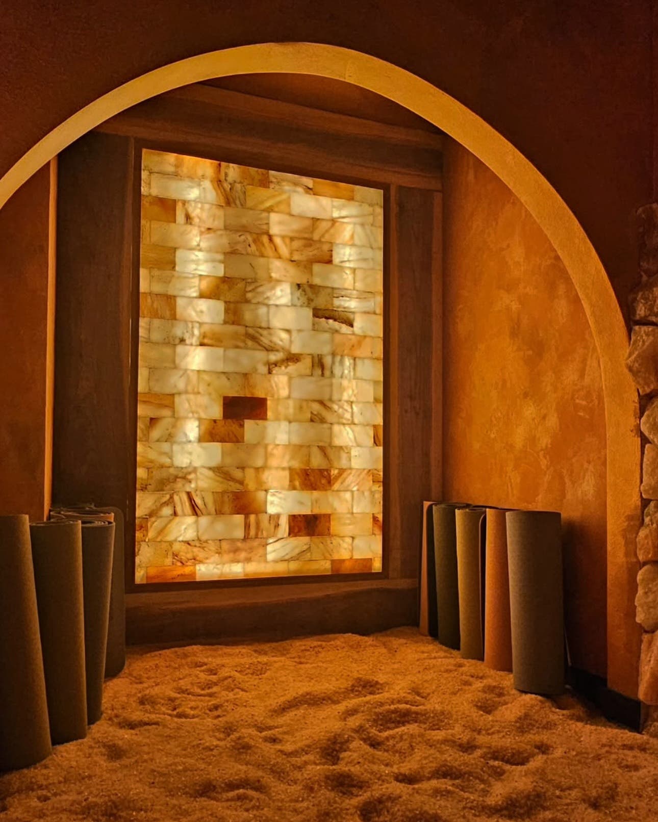 “Inside the two manmade caves, there is loose pink Himalayan salt like sand on the floor, salt bricks and boulders line the walls, and illuminated salt bricks are the light source,” she said. “When you arrive, you sit in a comfortable chair, the air is dry, cool, and filled with microscopic salt particles.”