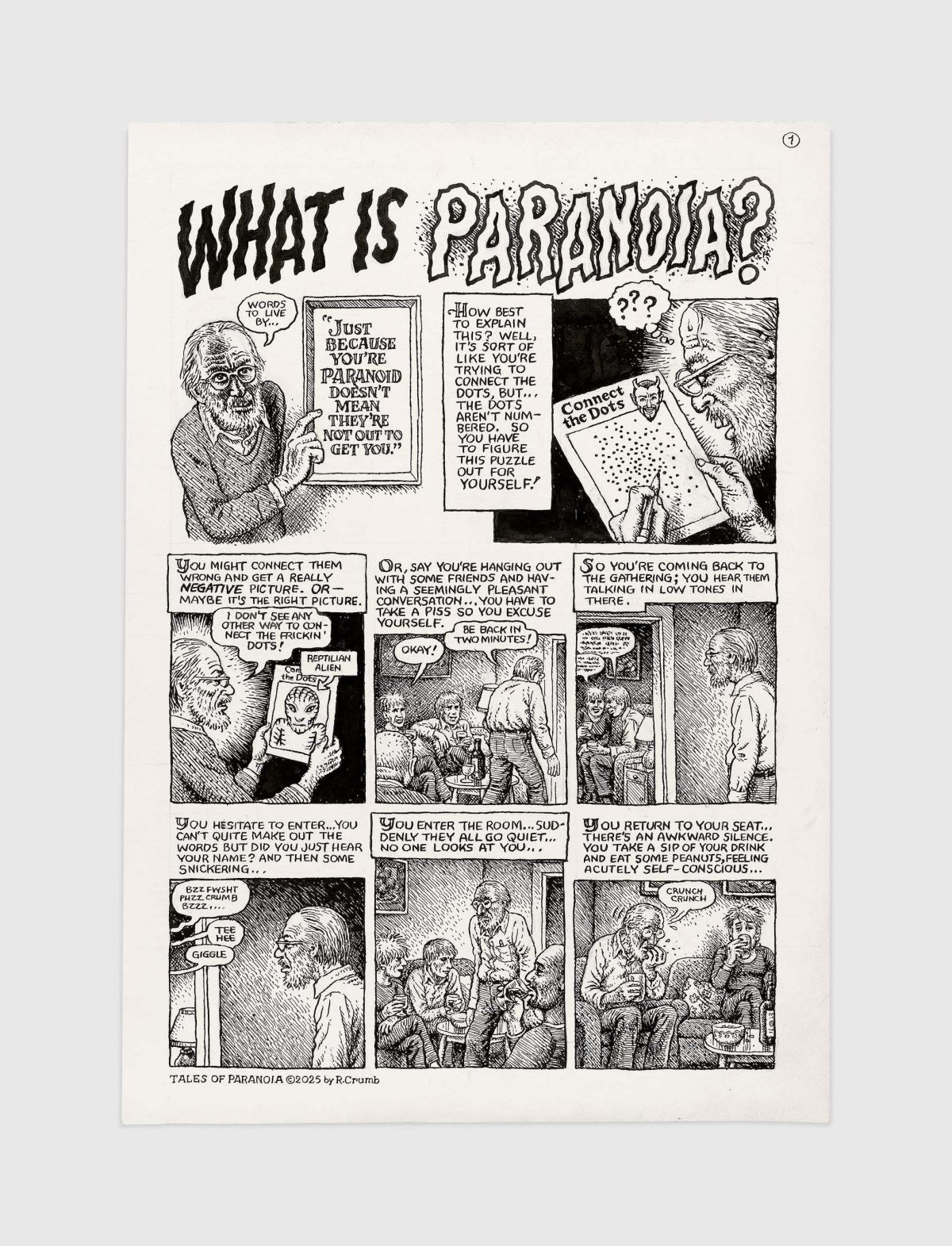 Page from R. Crumb, “What is Paranoia?” (2025) (© Robert Crumb, 2025, courtesy the artist, Paul Morris, and David Zwirner)